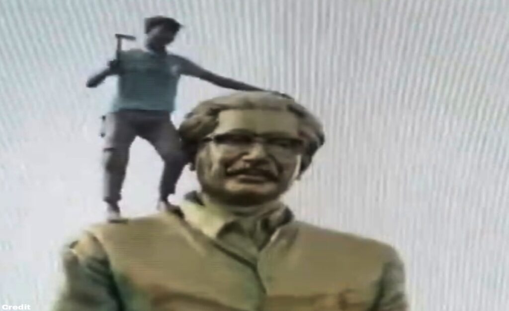 বিক্ষোভকারীরা ভাঙার চেষ্টা চালিয়ে যাচ্ছে বঙ্গবন্ধুর মূর্তি